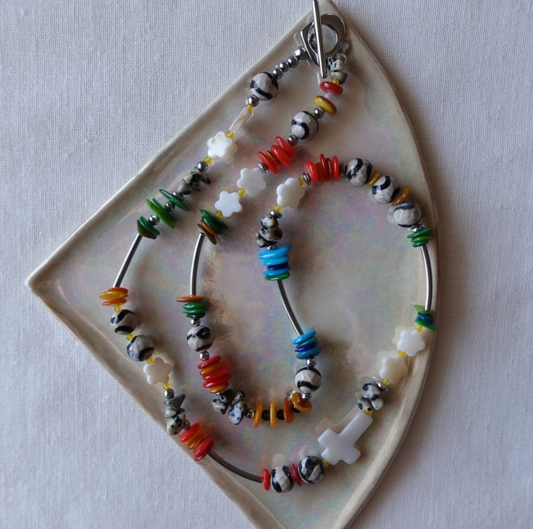 素材:シェル ダルメシアンジャスパー ヘマタイト メノウ ステンレスバー etc.
