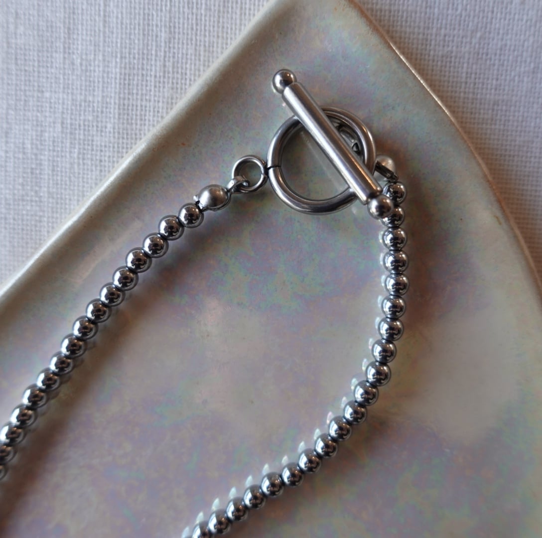 素材:ヘマタイト 淡水パール 金具:ステンレスマンテル 長さ:約37.5cm 重さ:約16g
