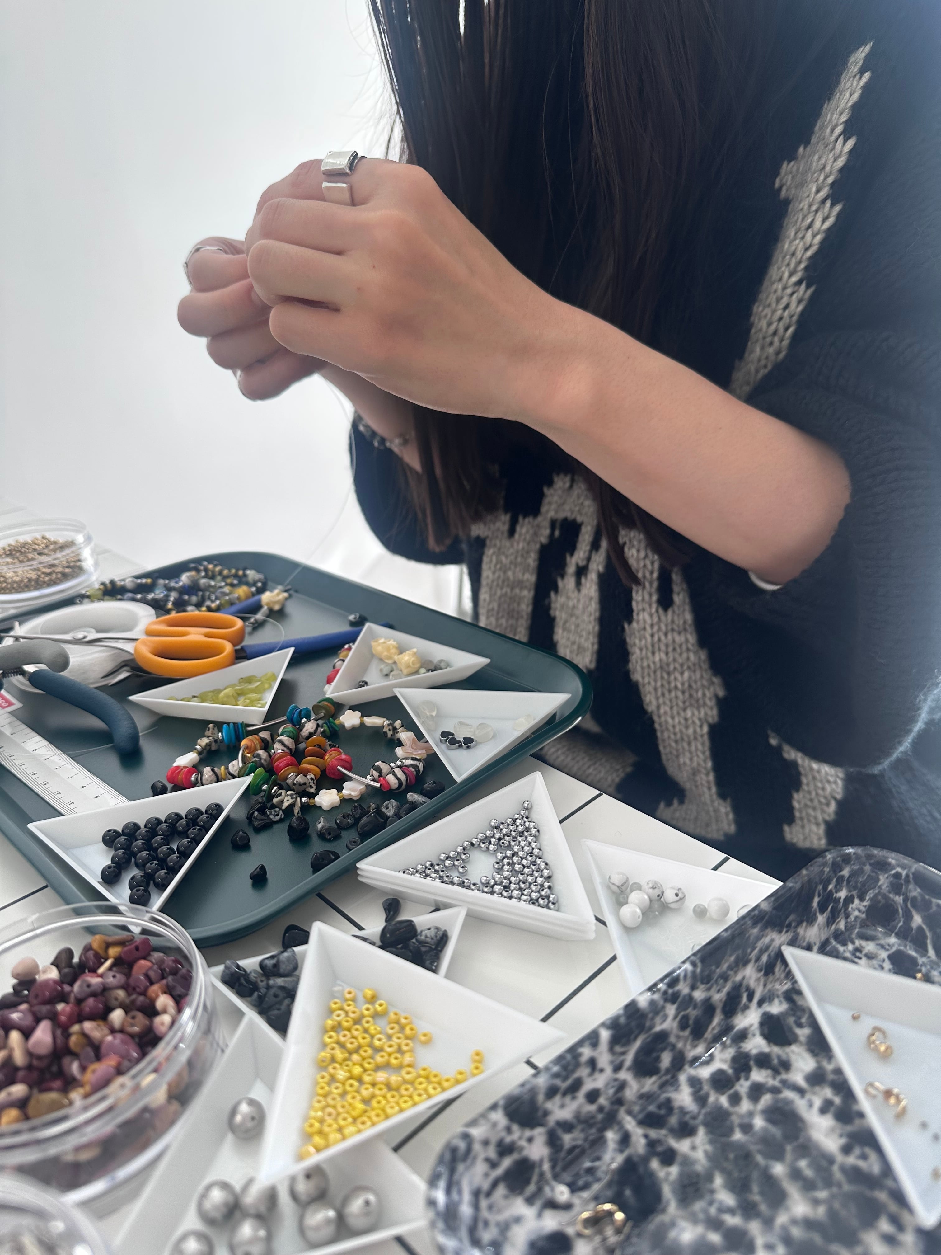 難しい金具部分はmeow側で制作しますので、ご本人は石選びと石をテグスに通すだけ(8800yen intax.)