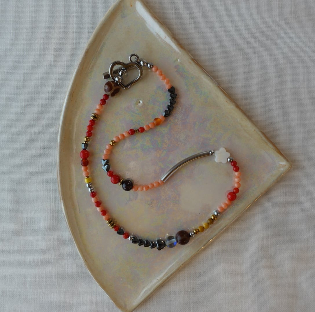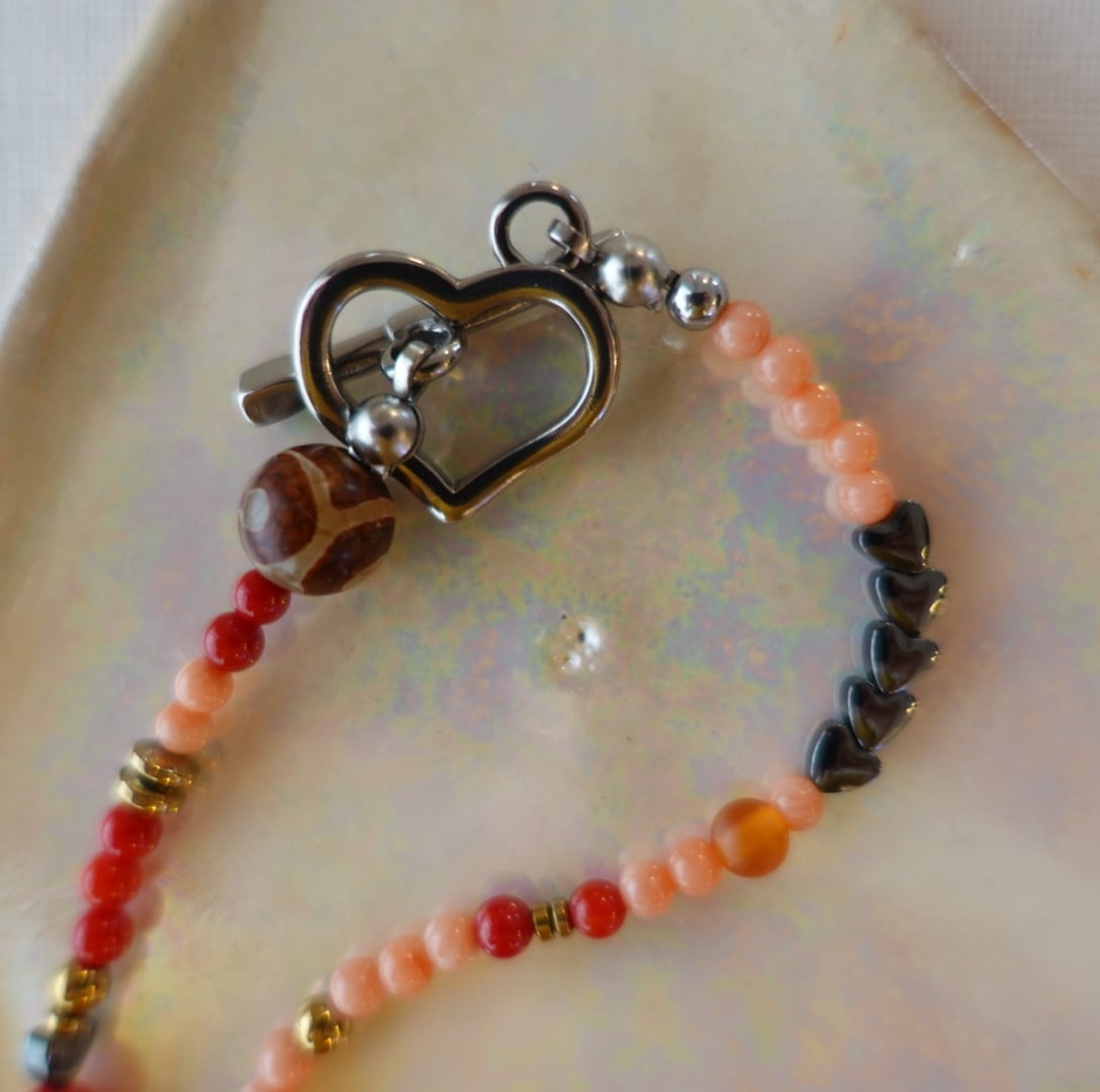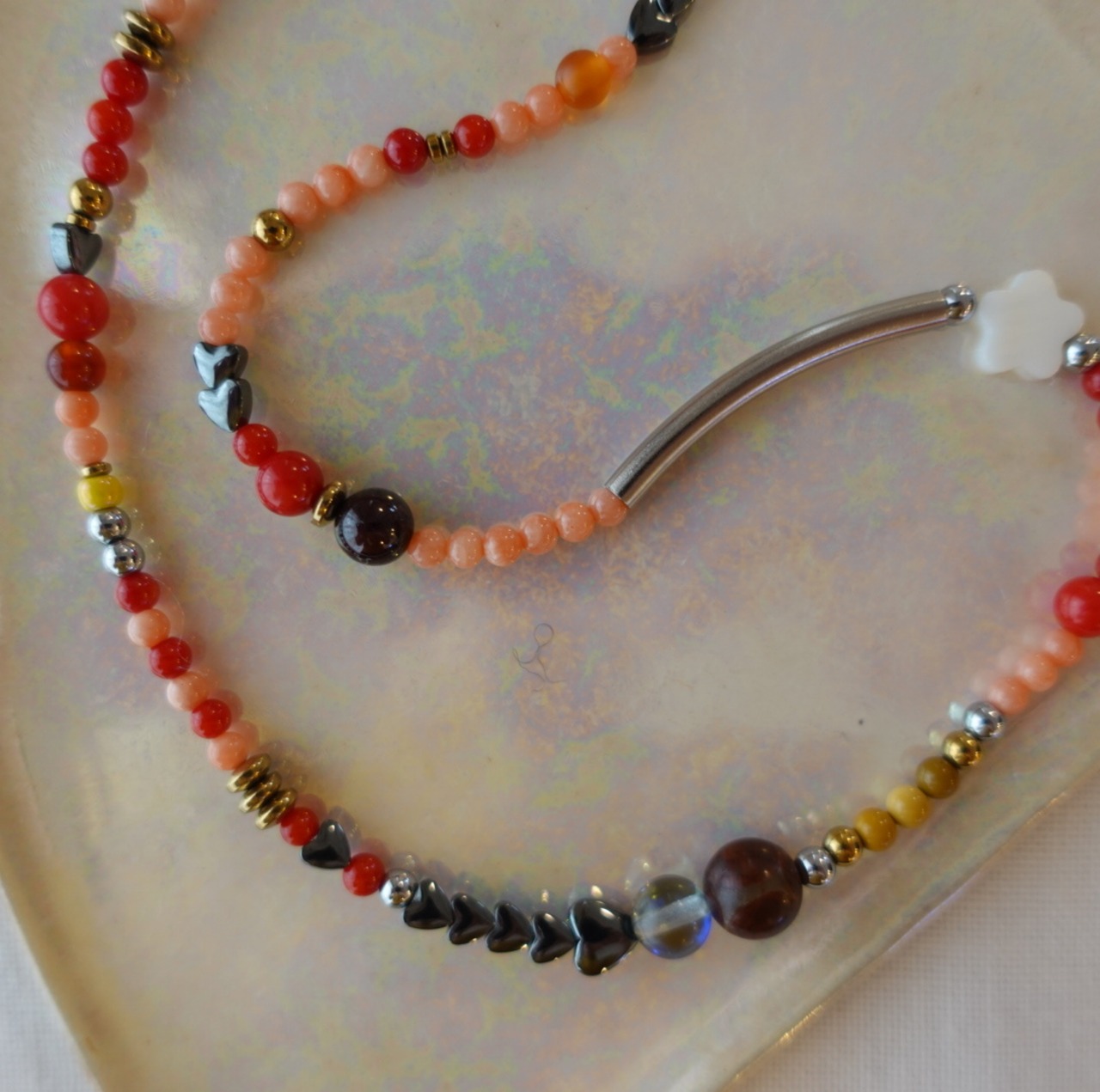 素材:ヘマタイト 赤染めサンゴ ピンク染めサンゴ シェル ステンレスバー メノウ etc.