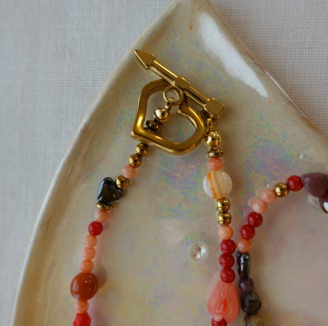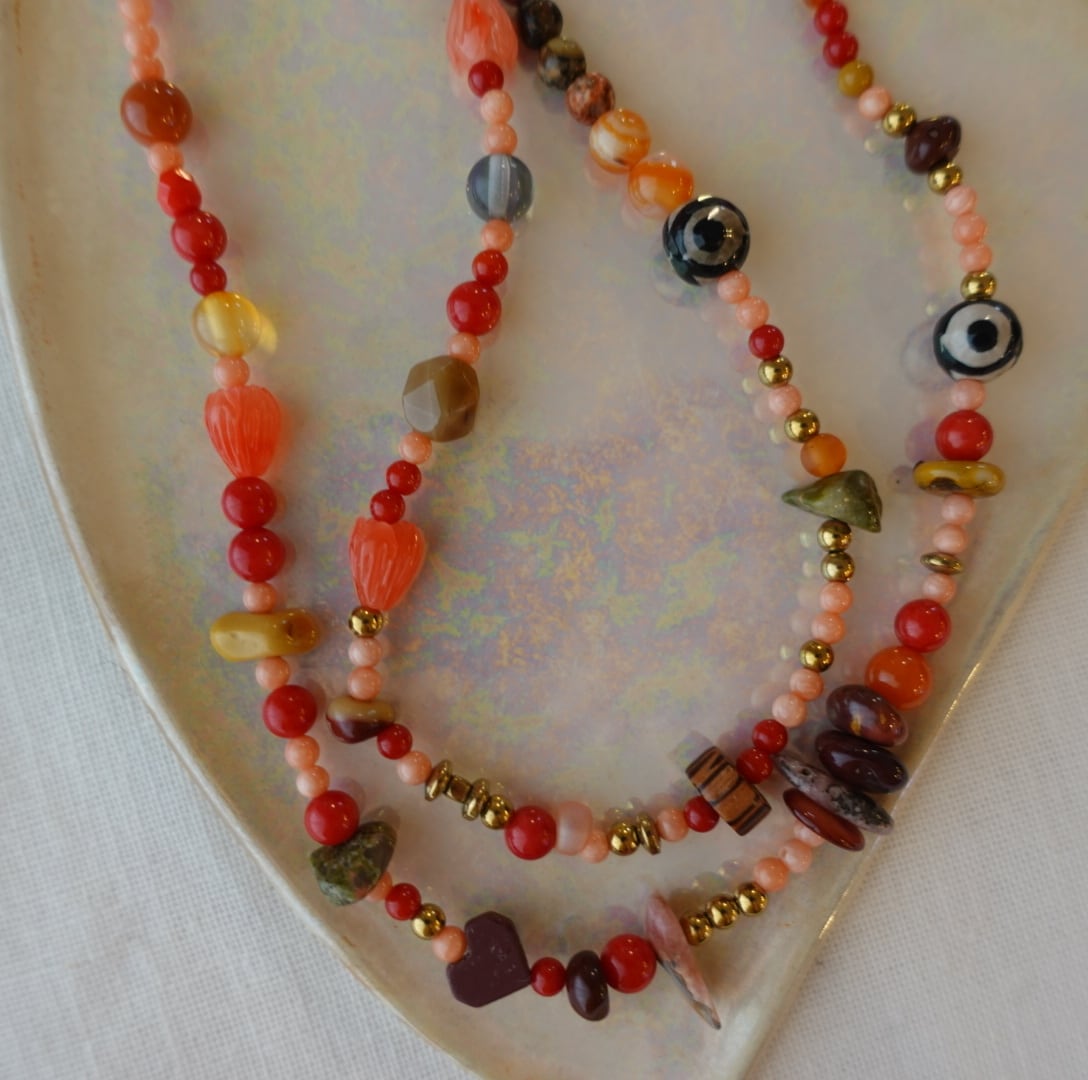 素材:赤染めサンゴ ピンク染めサンゴ ヘマタイト タイガーアイ ウッド 樹脂ビーズ ジャスパーetc.