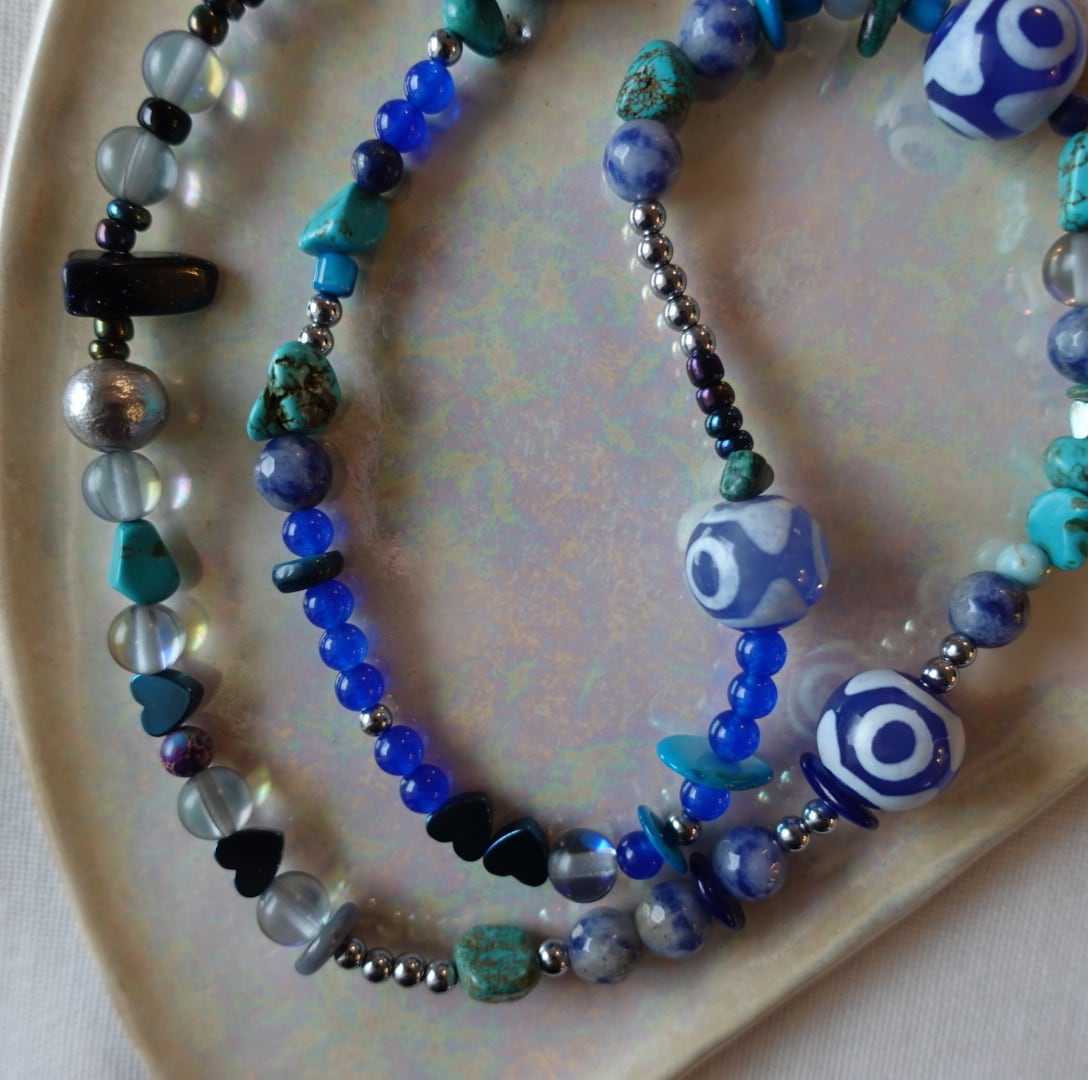 素材:ヘマタイト シェル ガラス アゲート ターコイズ ジェイド 金具:ステンレスマンテル 長さ:約48.5cm 重さ:約28g