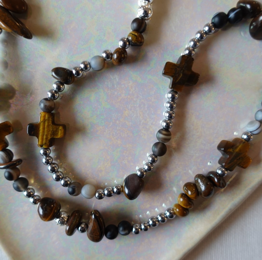 素材:ヘマタイト 溶岩石 タイガーアイ 金具:ステンレスマンテル 長さ:約43.5cm 重さ:約21g